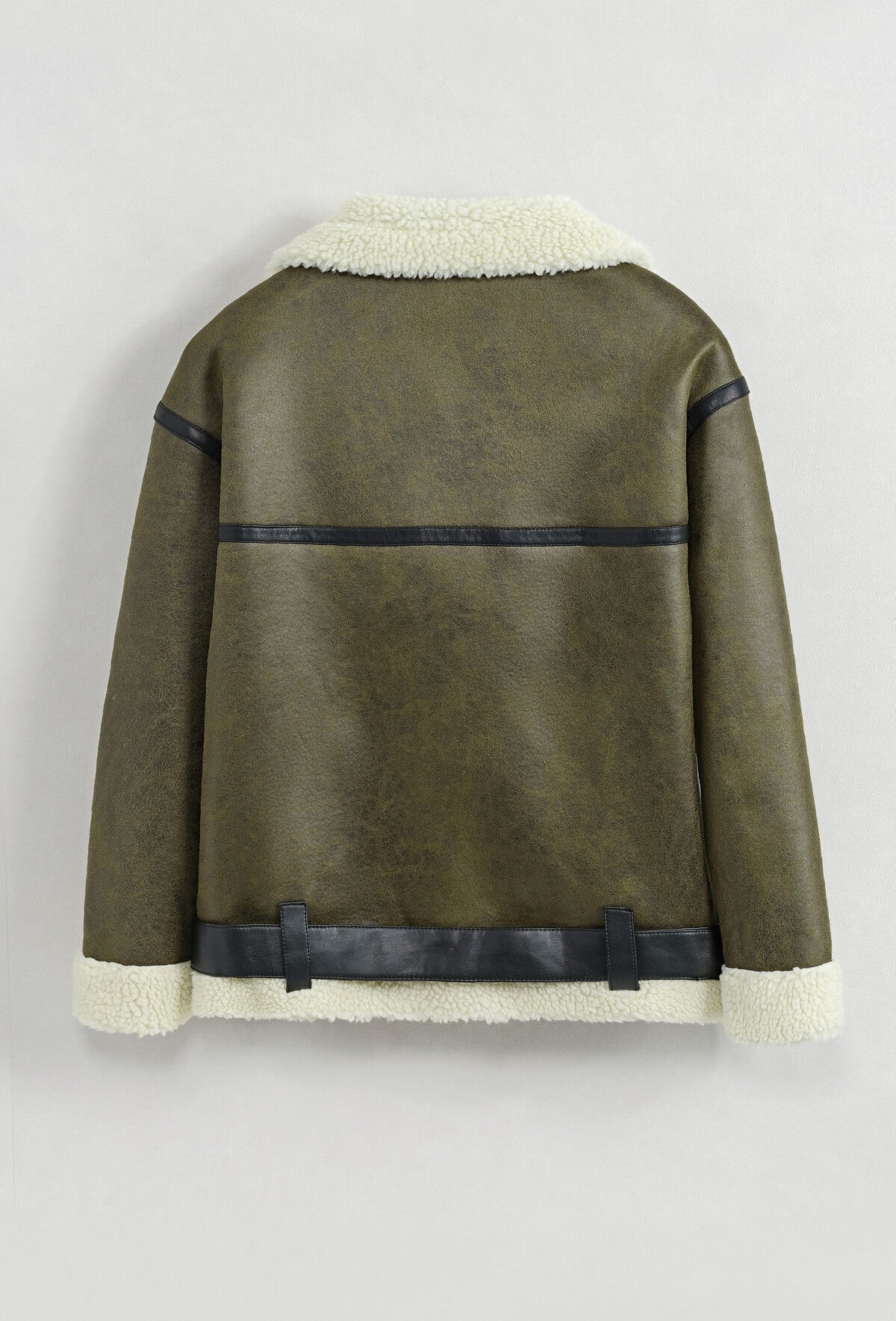 Vilken jacka som har inkommit! En oversized Aviator modell i fusk läder. Botten är mörkbrun och svarta dekor detaljer. Svart biker bälte nertill. Fickor med dragkeja på sidorna och dragkedja fram. Hel fodrad i mjukt teddymaterial i offwhite. Mycket bra längd som går ner precis under stussen.