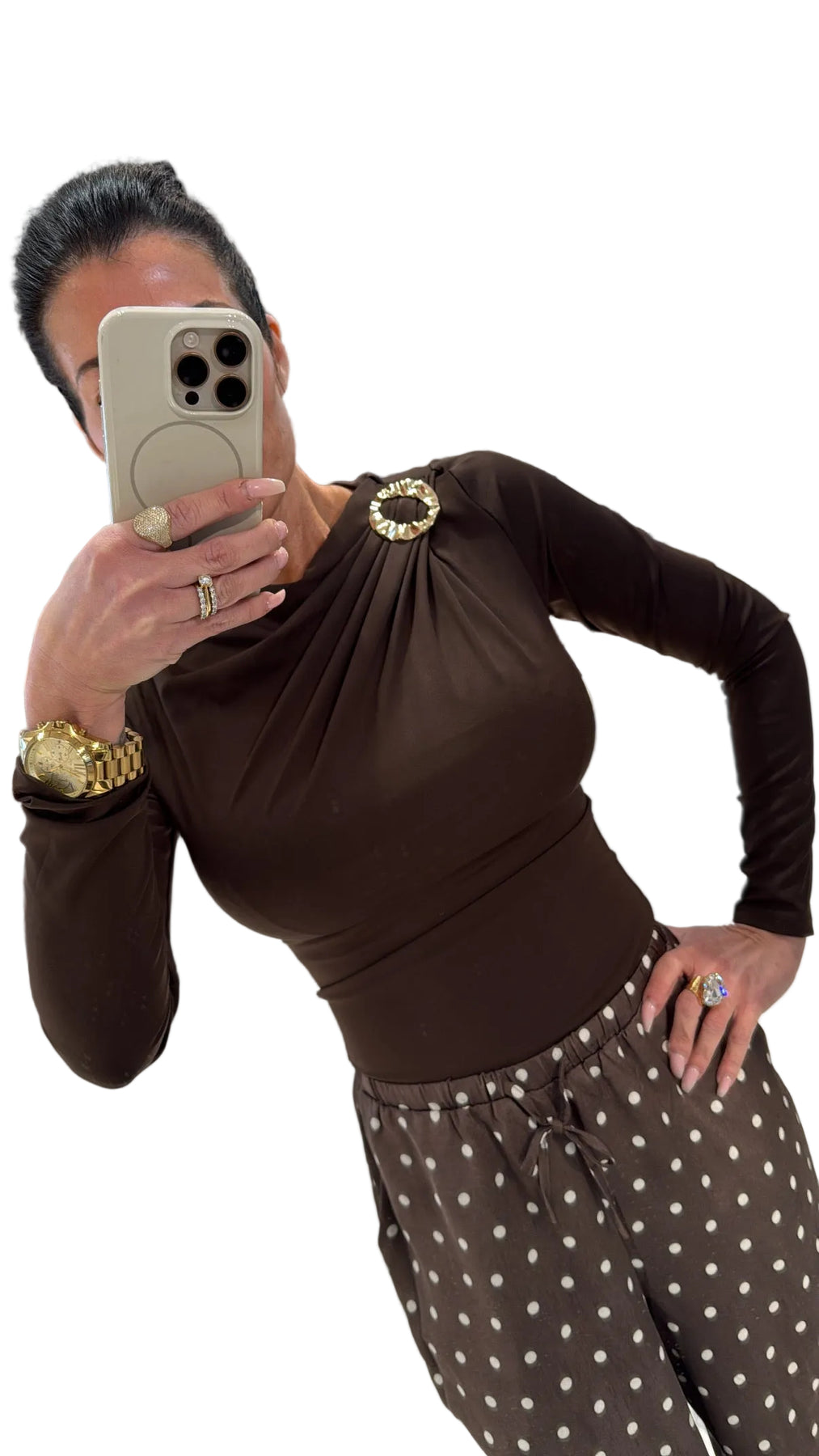 Body som har en draperad framsida. Tajt över ärm och rygg. Snyggt guldspänne uppe vid nyckelbenet. Liten i storlek, Gå upp en storlek.