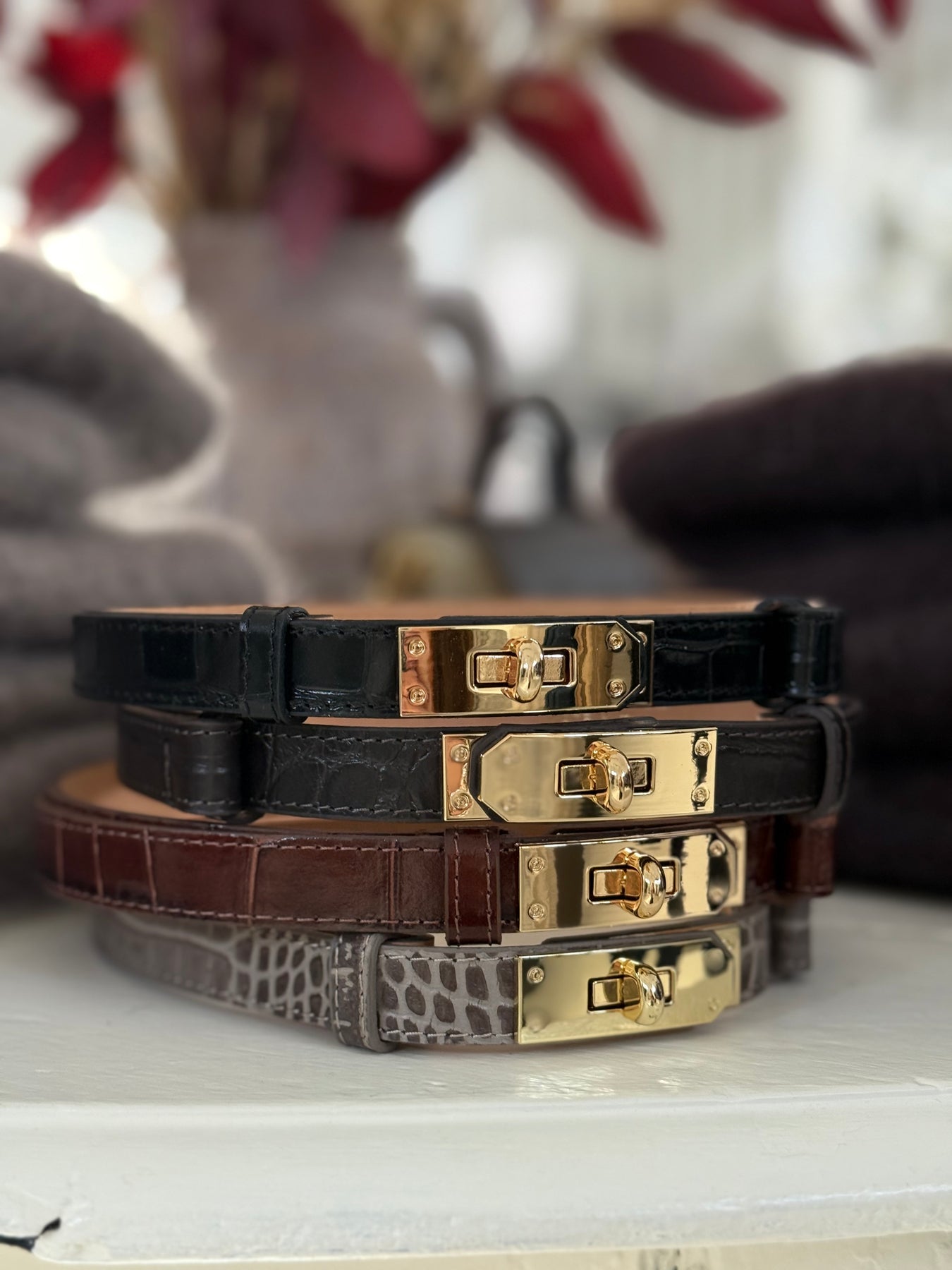 Det perfekta bältet som både är väldigt snyggt, trendigt och användbart. Ett onesize bälte som du själv justerar i läng, upp till 98 cm. Ett guldigt lås framtill. Snyggt till klänningar, kjolar och byxor, passar alla hällor. Snyggt även utanpå kavajer, kappor eller stora stickade tröjor där du vill markera midjan.