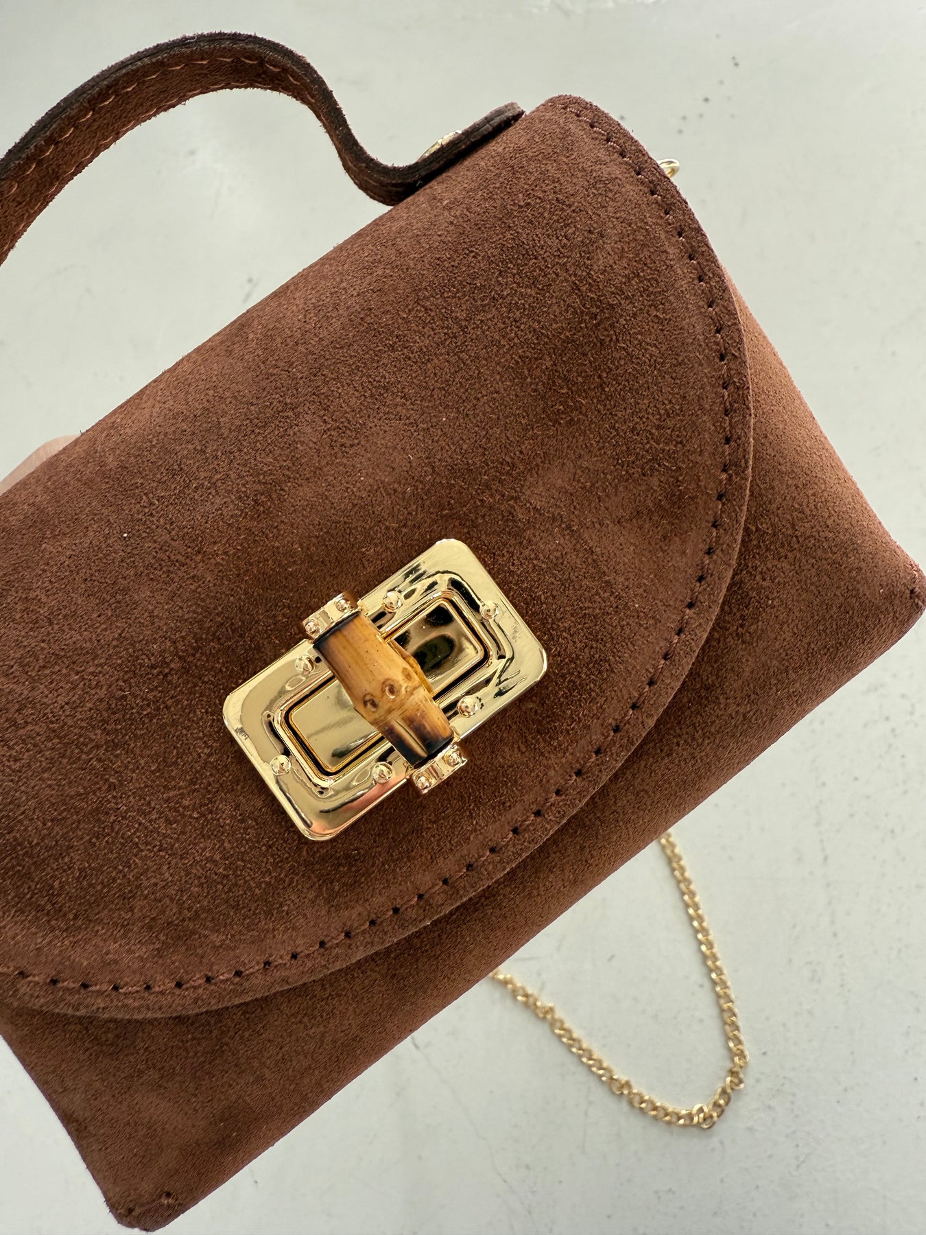 En musthave väska i lyxig mocka. En hård liten väska med utsökta detaljer i brun bambu och guld. Snygg att bära i handen men även som crossbody. En lång guldkedja medföjer. Denna kedja går ej att justera längd på.