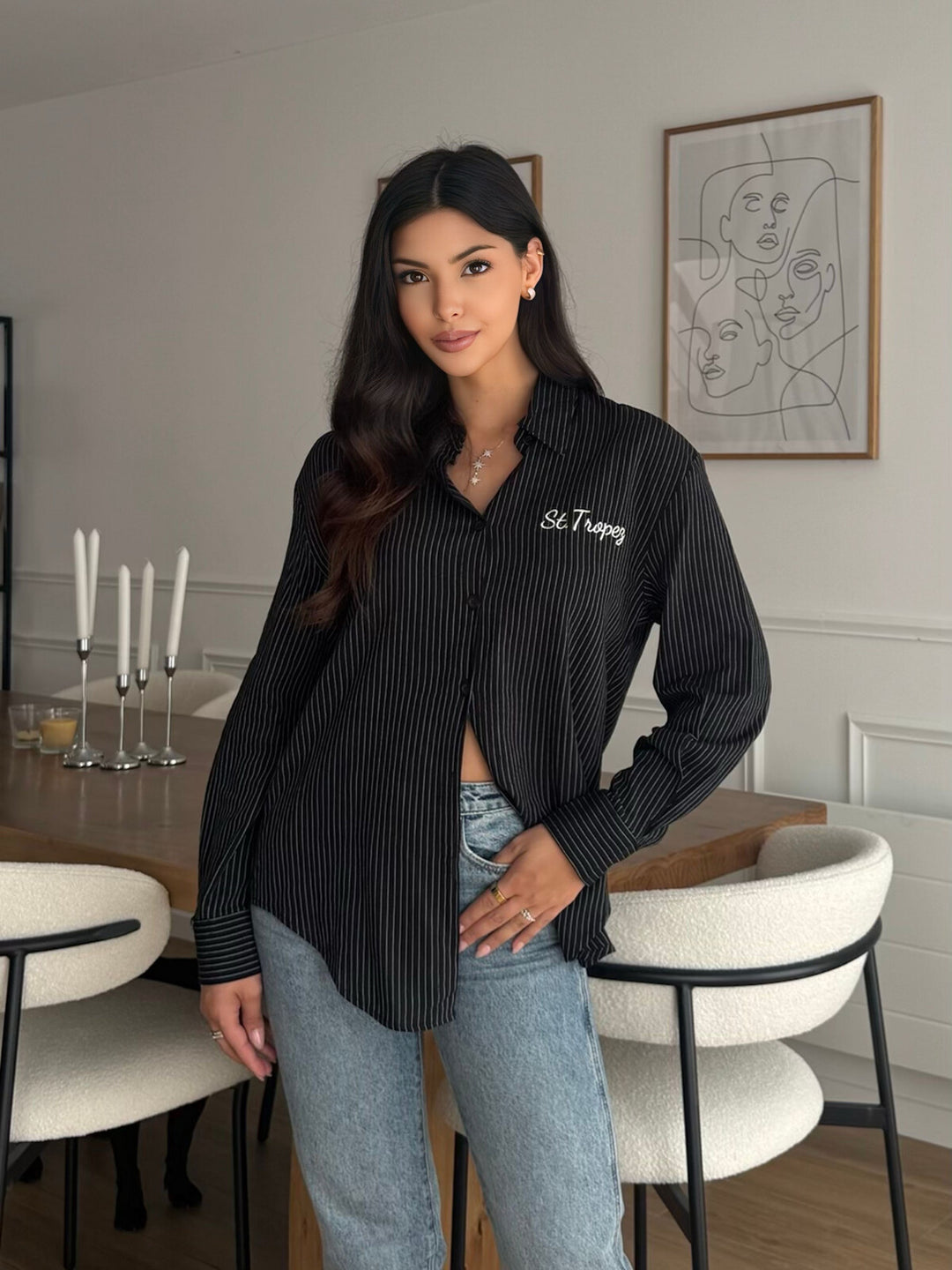 SELECTED BY KABARE - Tropez - Kritstrecks randig skjorta med brodyr - Svart