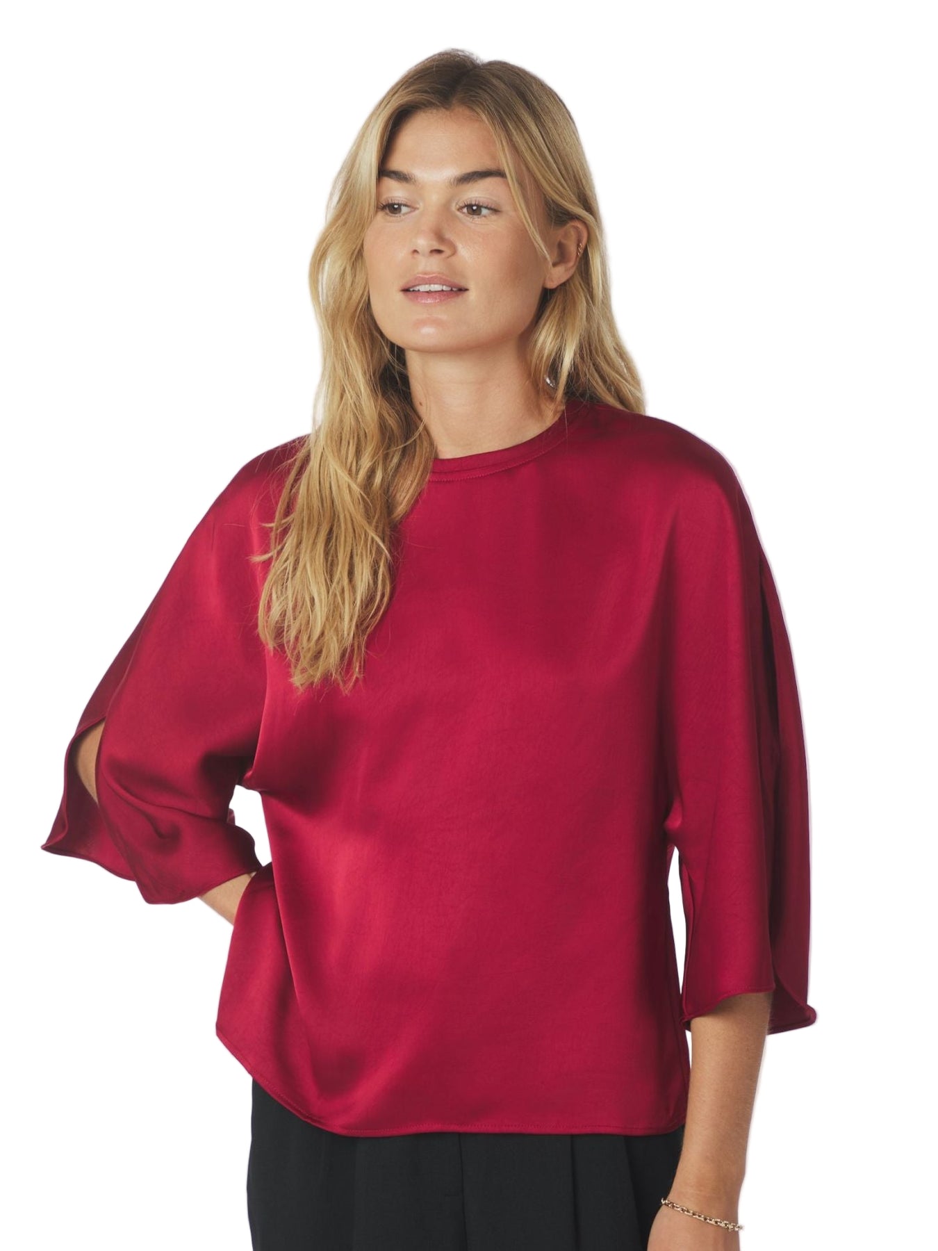 Feminine blus med smickrande lösa ärmar med hög slits. Blusen kommer i en satin kvalitet. Modellen är 176 cm och bär storlek 36.