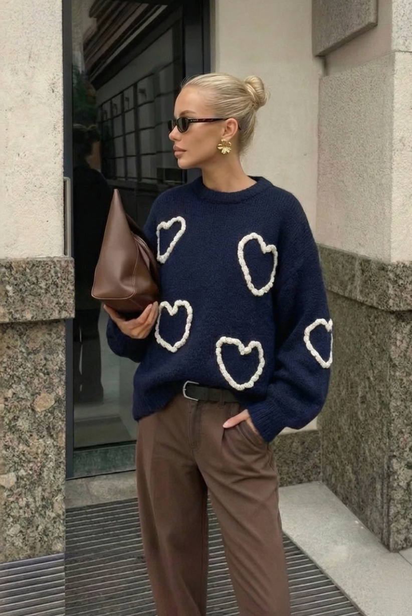 Ursnygg oversized tröja mjukt material. Mysig ballongärm och rund hals. Virkade hjärtan i kontrastfärg. Magiskt snygg jeans!
