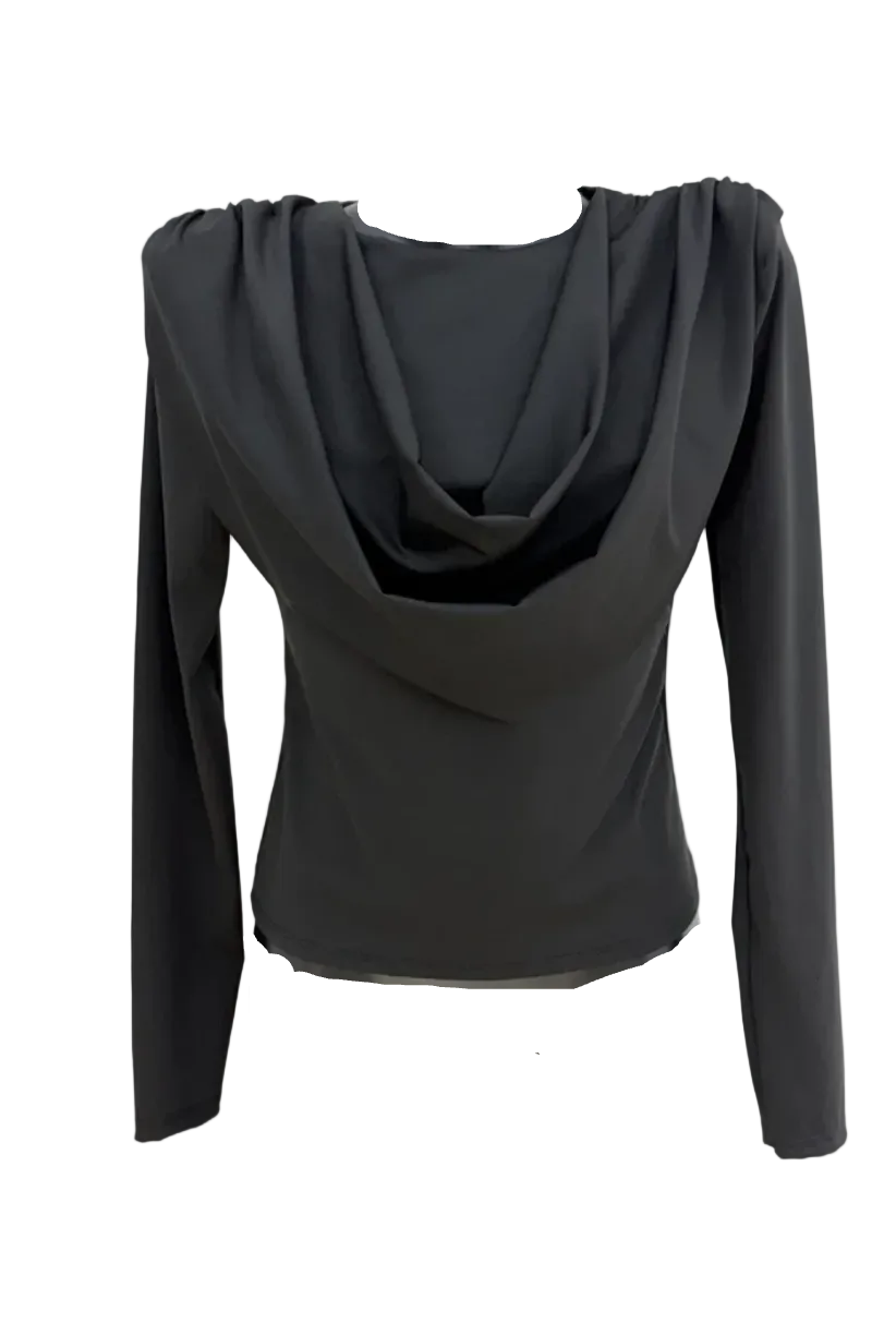 Elegant men kaxig top med stora axelvaddar och vattenfallskrage. Tajt ärm, inga muddar, så lätt att stoppa ner i både kjolar och kostymbyxor.