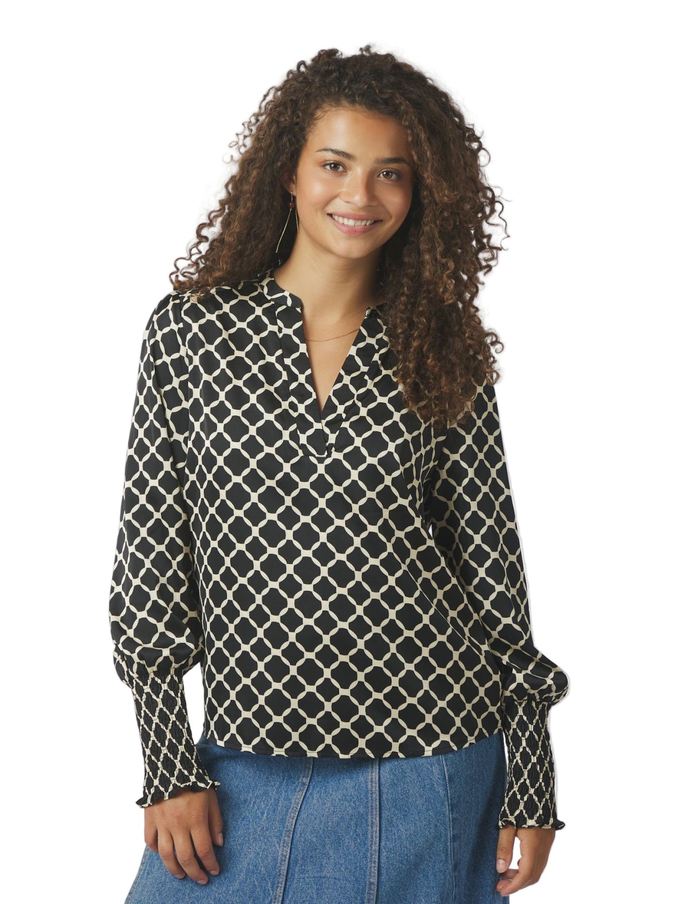 Feminint blus i lös passform med smockade ärmslut och öppen halsringning med v-ringning. Blusen kommer i ett grafiskt mönster. Modellen är 176 cm och bär storlek 36.