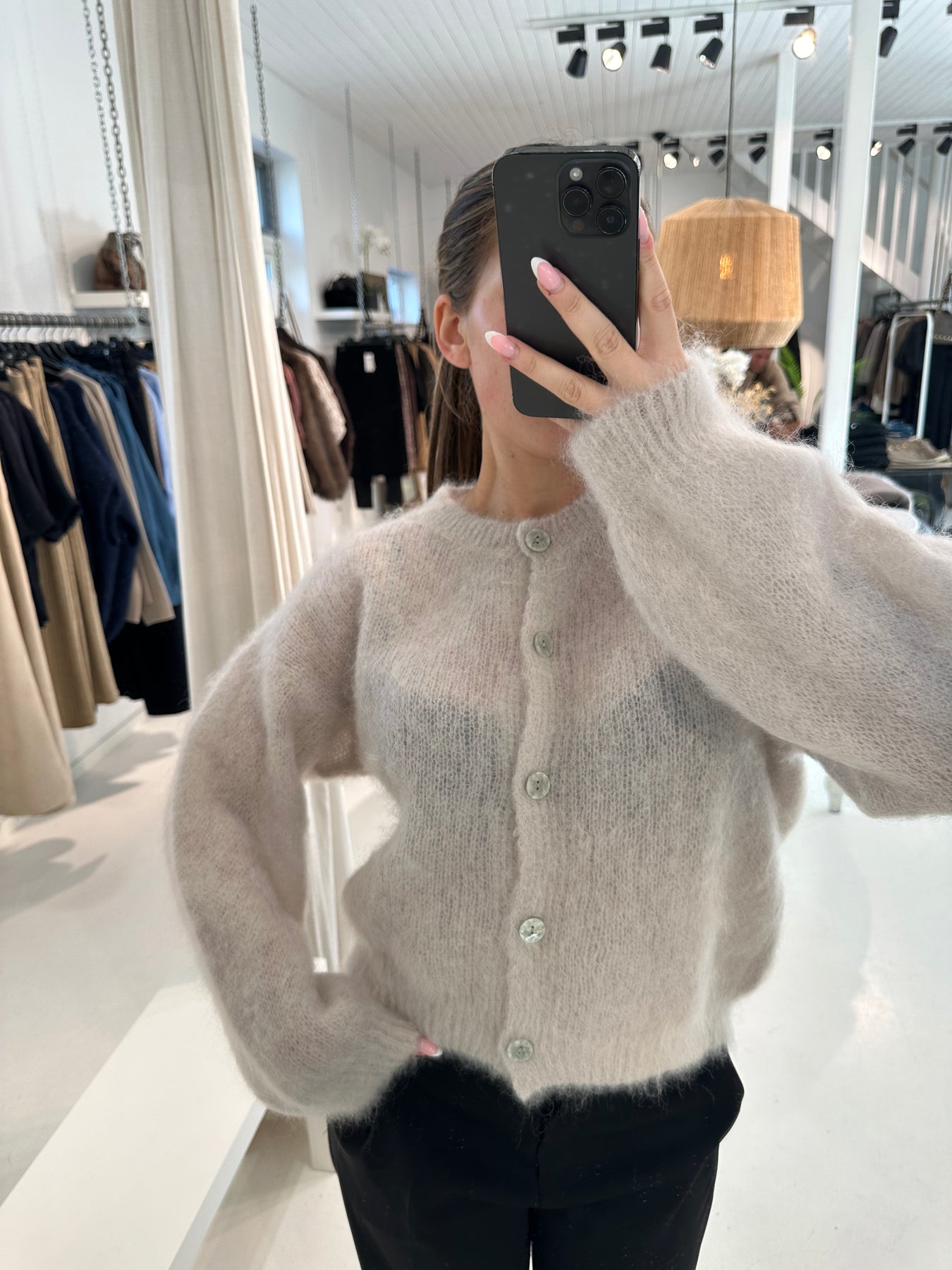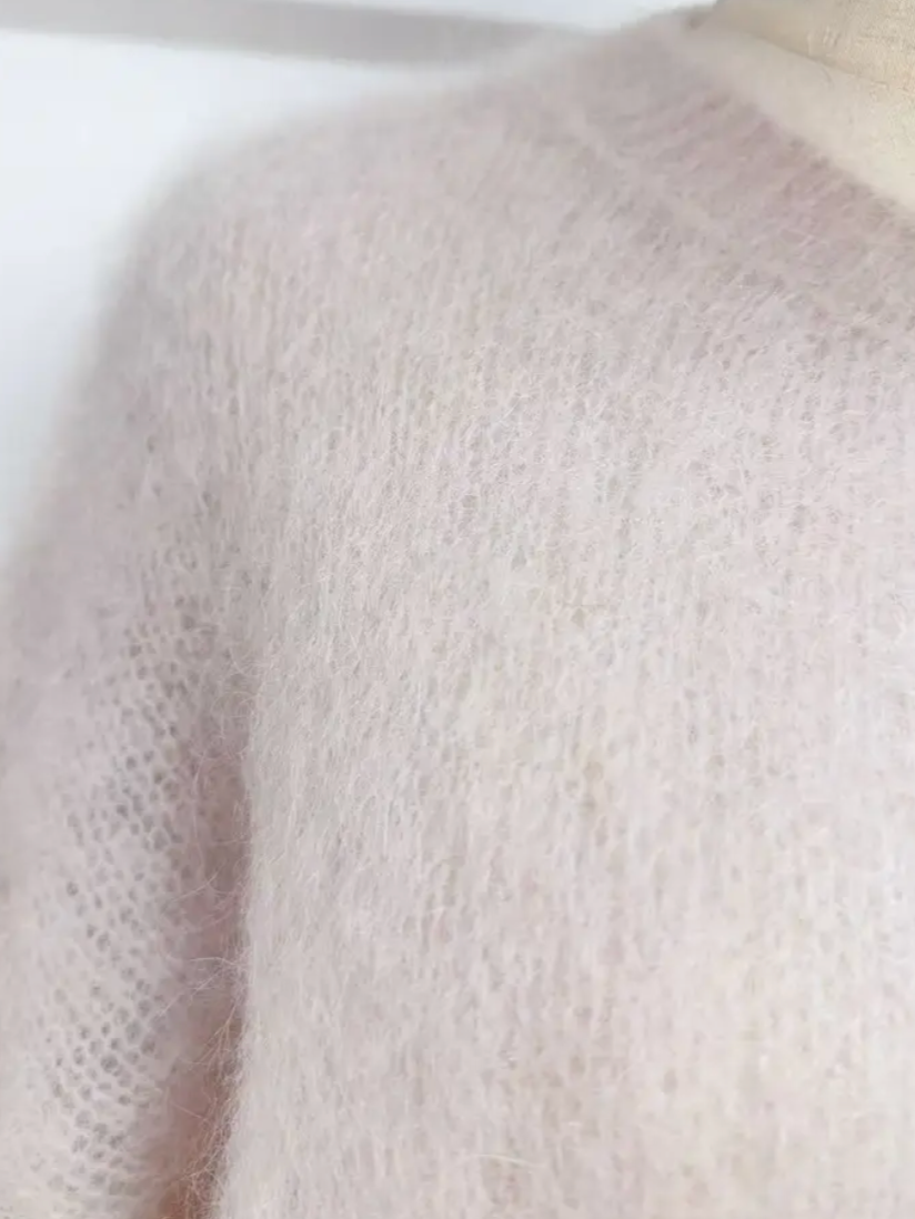 i mjuk baby mohair,  med något större knappar fram. En rund hals. Lite vidare ärm med ballong effekt.