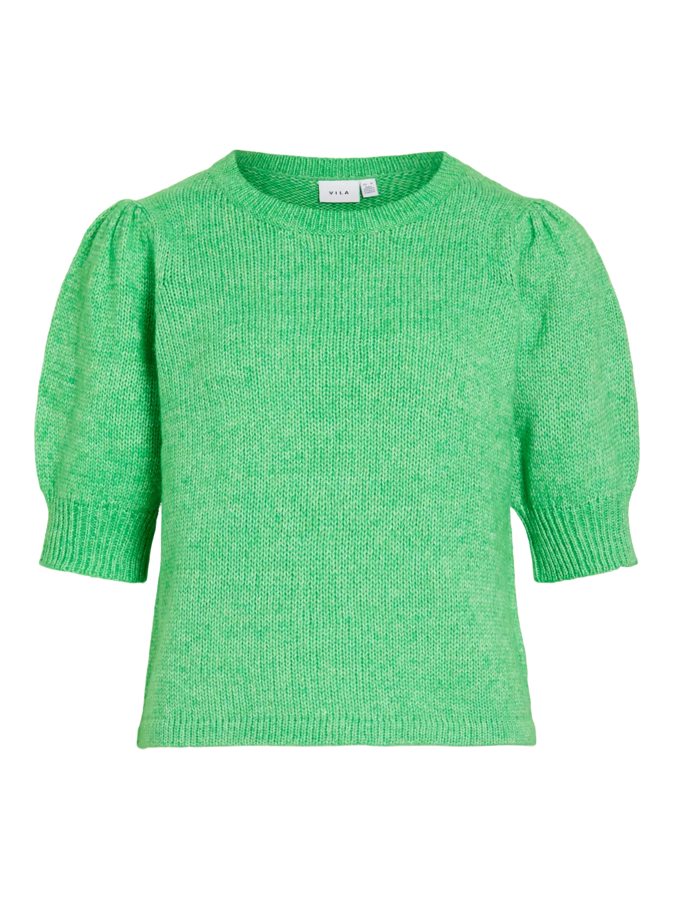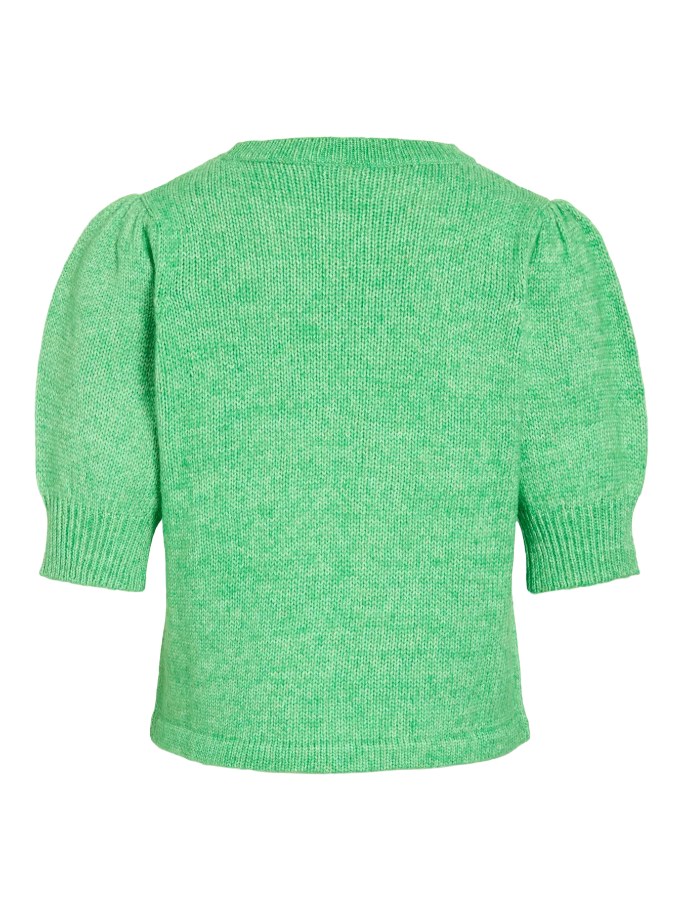 En liten planstickad tröja med rund hals och ursöt puffärm. Helt rakt avslut och ingen mudd. Modellen på tröjan är något kortare. Välj din vanliga storlek, men om du är lång så går du upp en storlek. Den blir bredare på dig men även något lite längre.