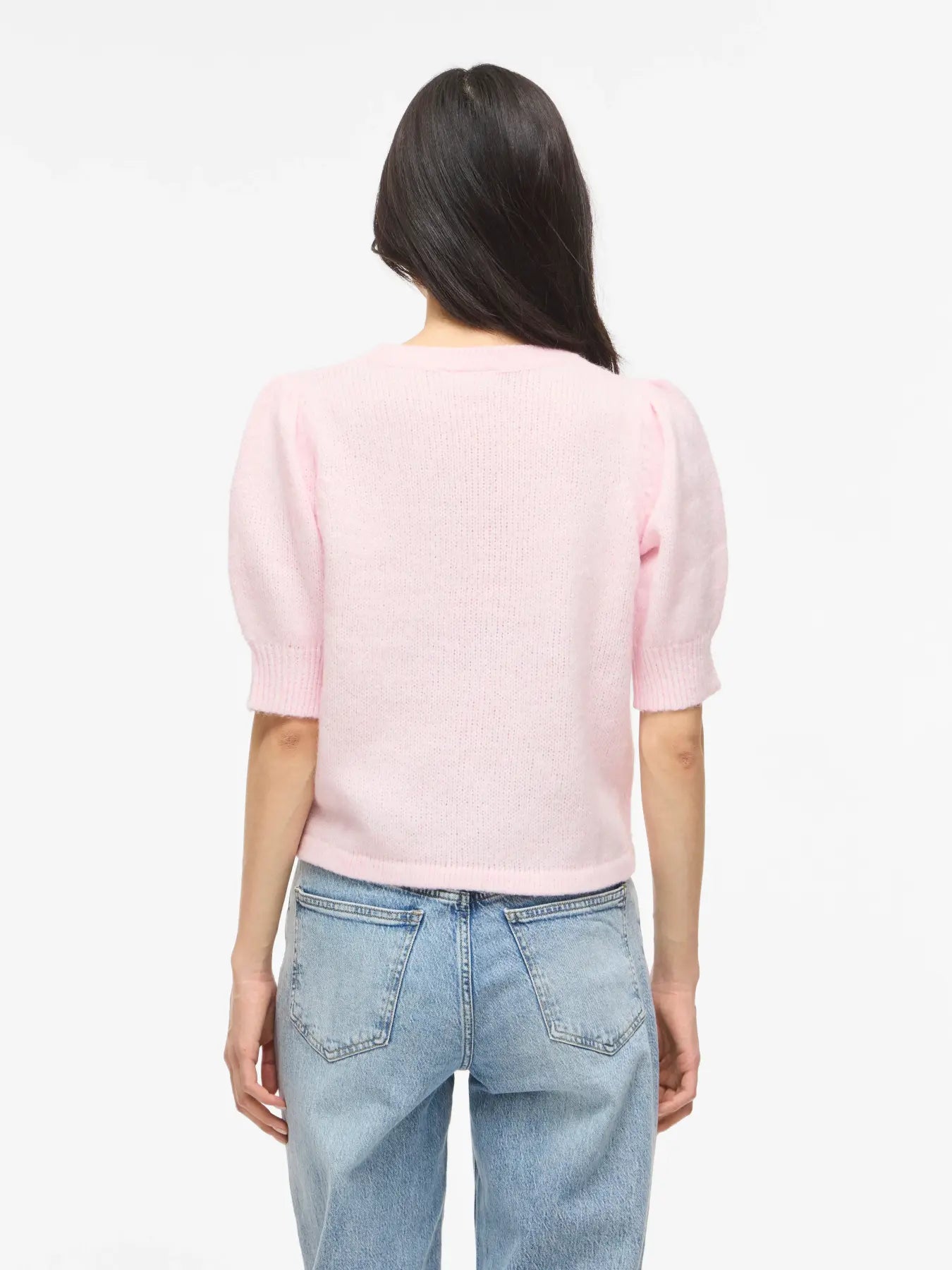 En liten planstickad tröja med rund hals och ursöt puffärm. Helt rakt avslut och ingen mudd. Modellen på tröjan är något kortare. Välj din vanliga storlek, men om du är lång så går du upp en storlek. Den blir bredare på dig men även något lite längre.