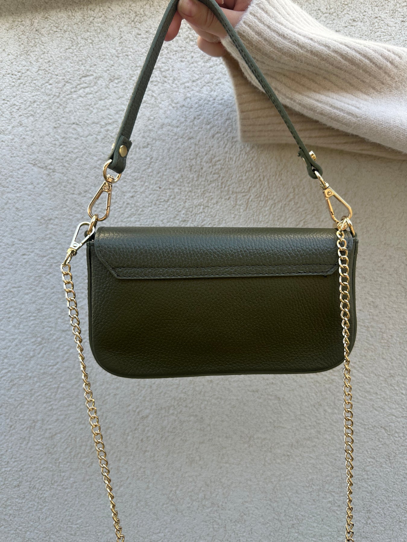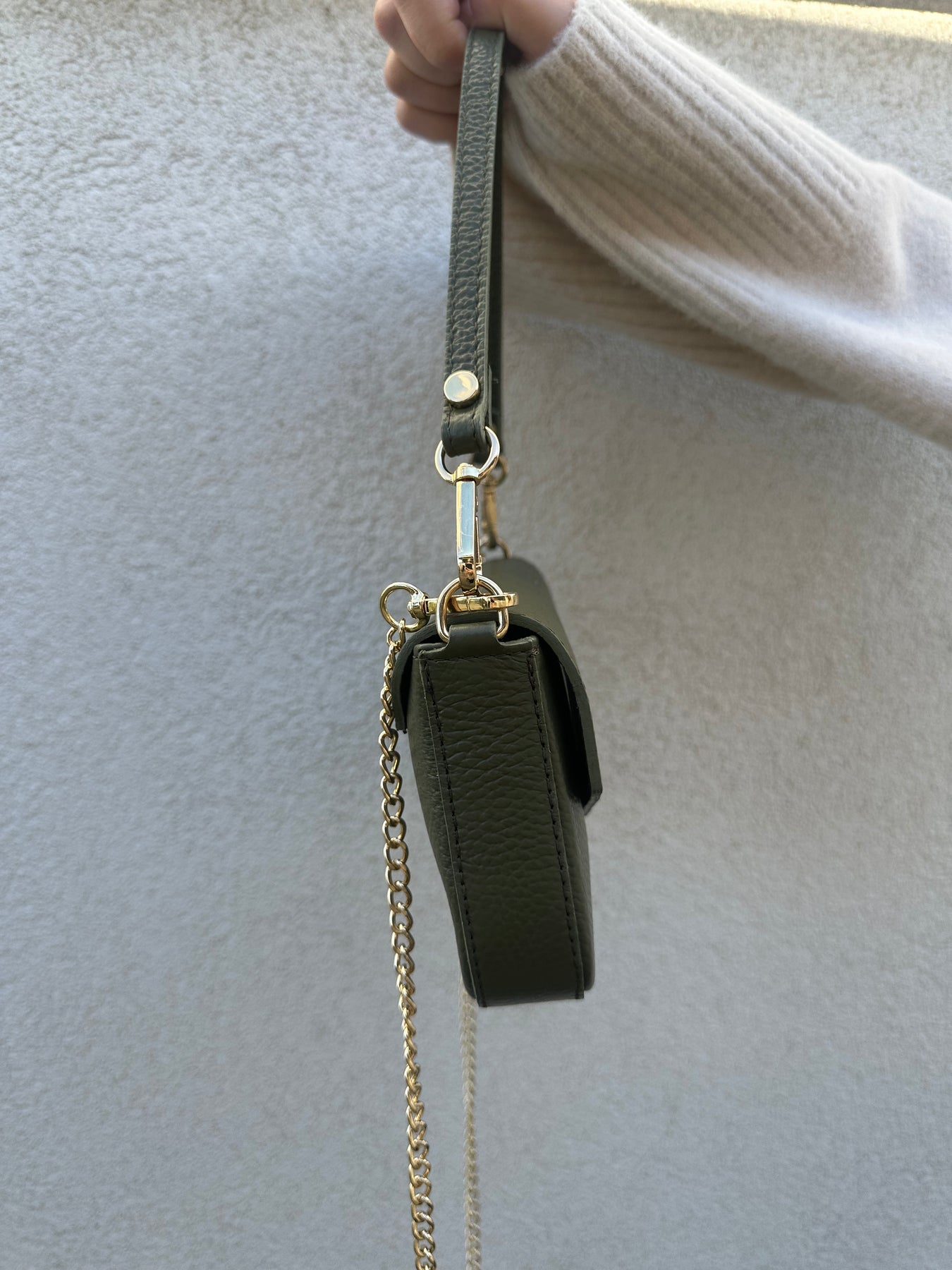Mycket lyxig och elegant liten kuvertväska i 100% mjukt läder. En guldknapp fram med magnetlås. Ett fack innut i och ett mindre fack för dina kort på sidan. En lång guldkedja i pansarmodell medföljer så väskan kan bäras crossbody, på axel, i armveck och i handen. En perfekt väska till fest, middag osv