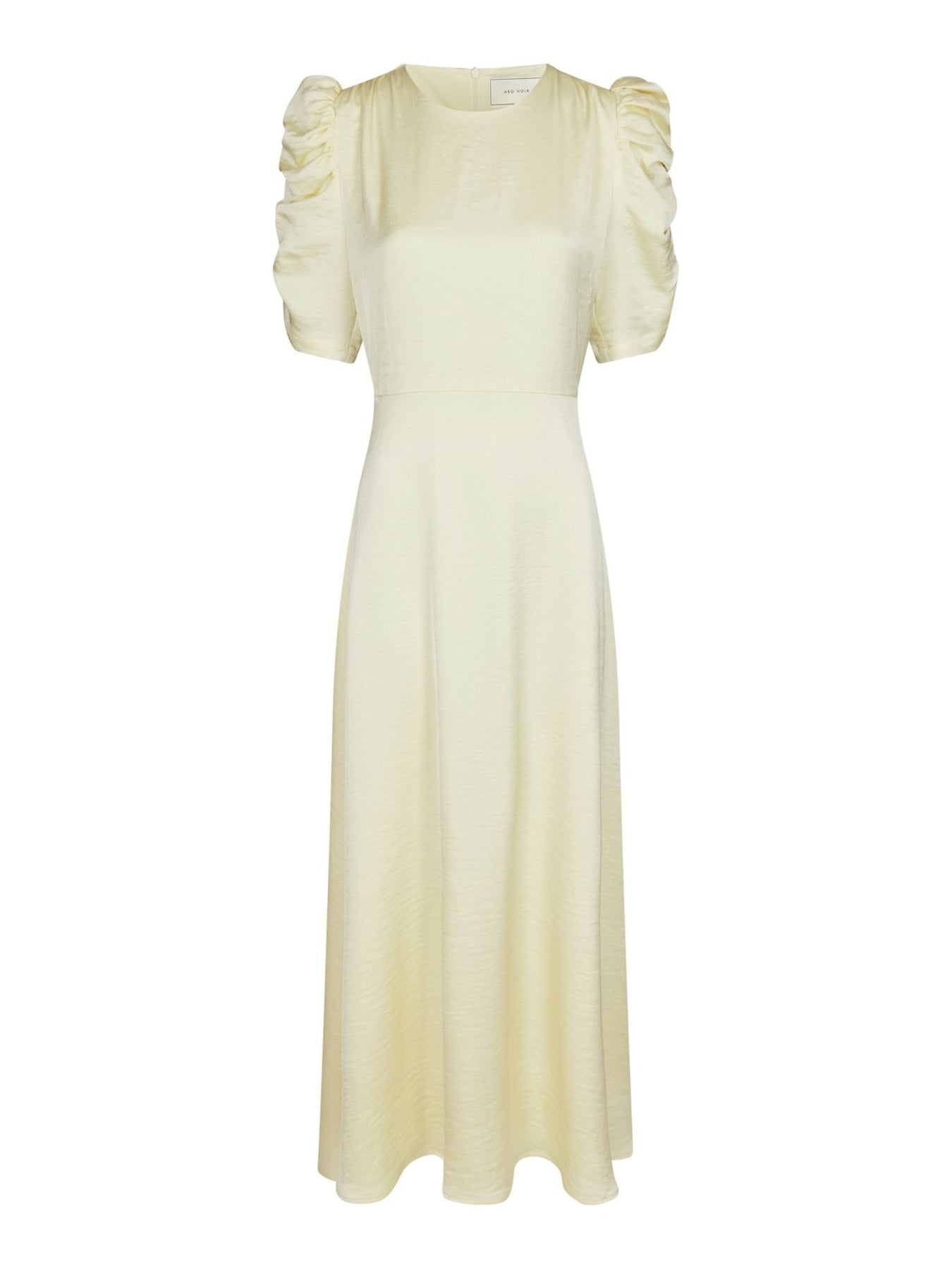 Elegant och feminin lång klänning. Klänningen har korta ärmar med rynkeffekt och dragkedja i nacken. Vackert lyster i tyget. Sitter tajtare över bystpartiet och vid midjan för att sedan släppa och få en vacker vidd och fall. Perfekt till dop, bröllop och student. Modellen är 176 cm lång och bär storlek 36.