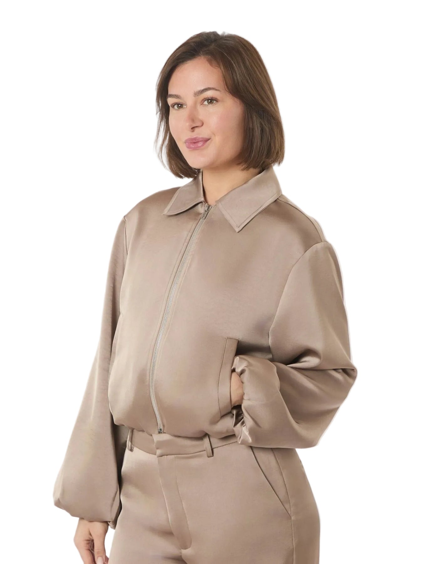 Cool bomberjacka i en fin, tung sateen-kvalitet. Jackan har långa, lösa ärmar med elastik vid ärmsluten och i nederkant. Den stängs med en dragkedja framtill. Passar som ett set ihop med byxan Emmette . Modellen är 176 cm lång och bär