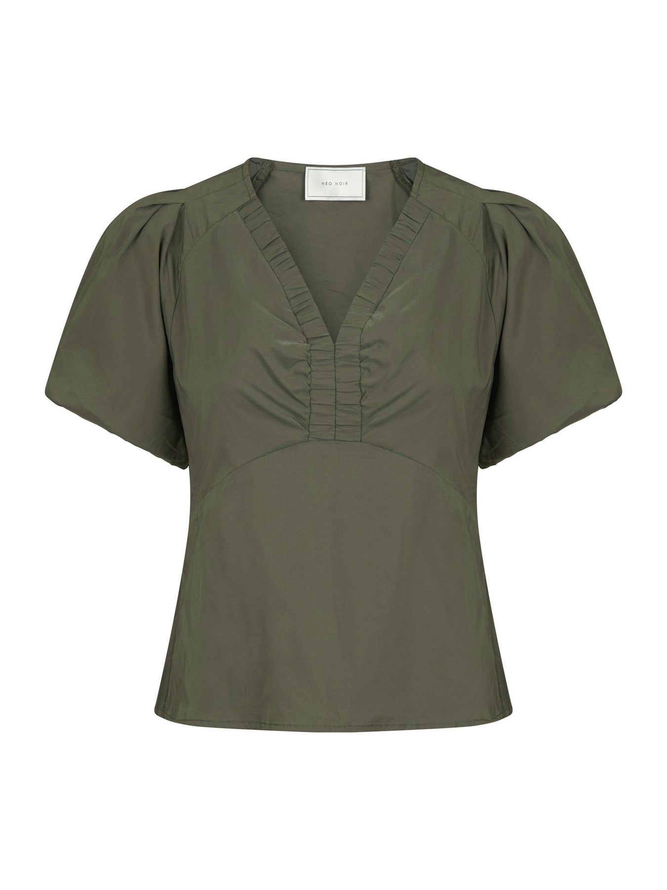 Vår bästsäljande blus med en V-ringning utav resår, samlingsdetaljer och korta puffärmar med resår avslut. Blusen har ett vackert tyg poplin bomullstyg med lyster och är tillverkad i mjukt och följsamt material med en dold dragkedja i sidan
