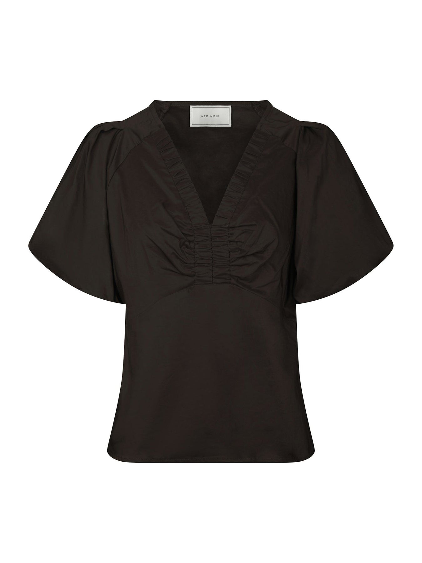 Vår bästsäljande blus med en V-ringning utav resår, samlingsdetaljer och korta puffärmar med resår avslut. Blusen har ett vackert tyg poplin bomullstyg med lyster och är tillverkad i mjukt och följsamt material med en dold dragkedja i sidan