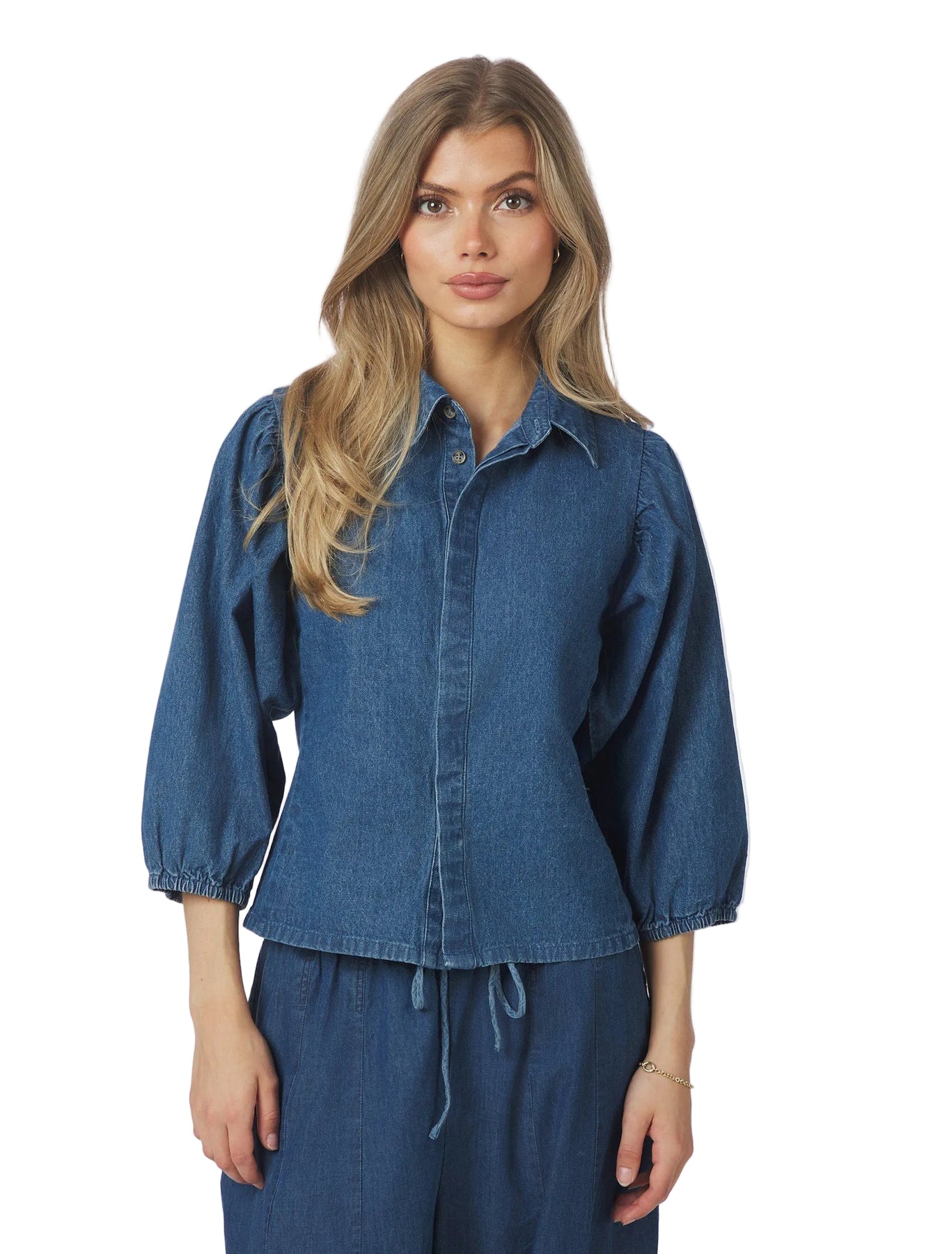 Mjuk och skön denimblus med puffärmar och krage samt dold knäppning fram.Smickrande passform och feminin look. Modellen är 176 cm och bär storlek 36. Välj din vanliga storlek.
