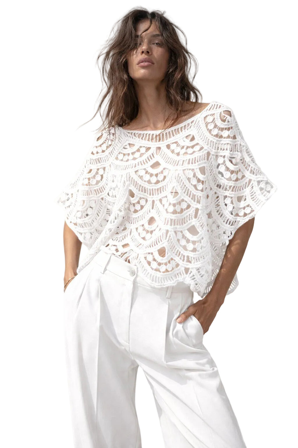 Vackert bohemisk tröja i virkat spets. Ärmen har en trekvarts längd och är vid. Halsen har en bredare båthalsad urringning. Perfekt i sommar till slitna jeans och jeans shorts.