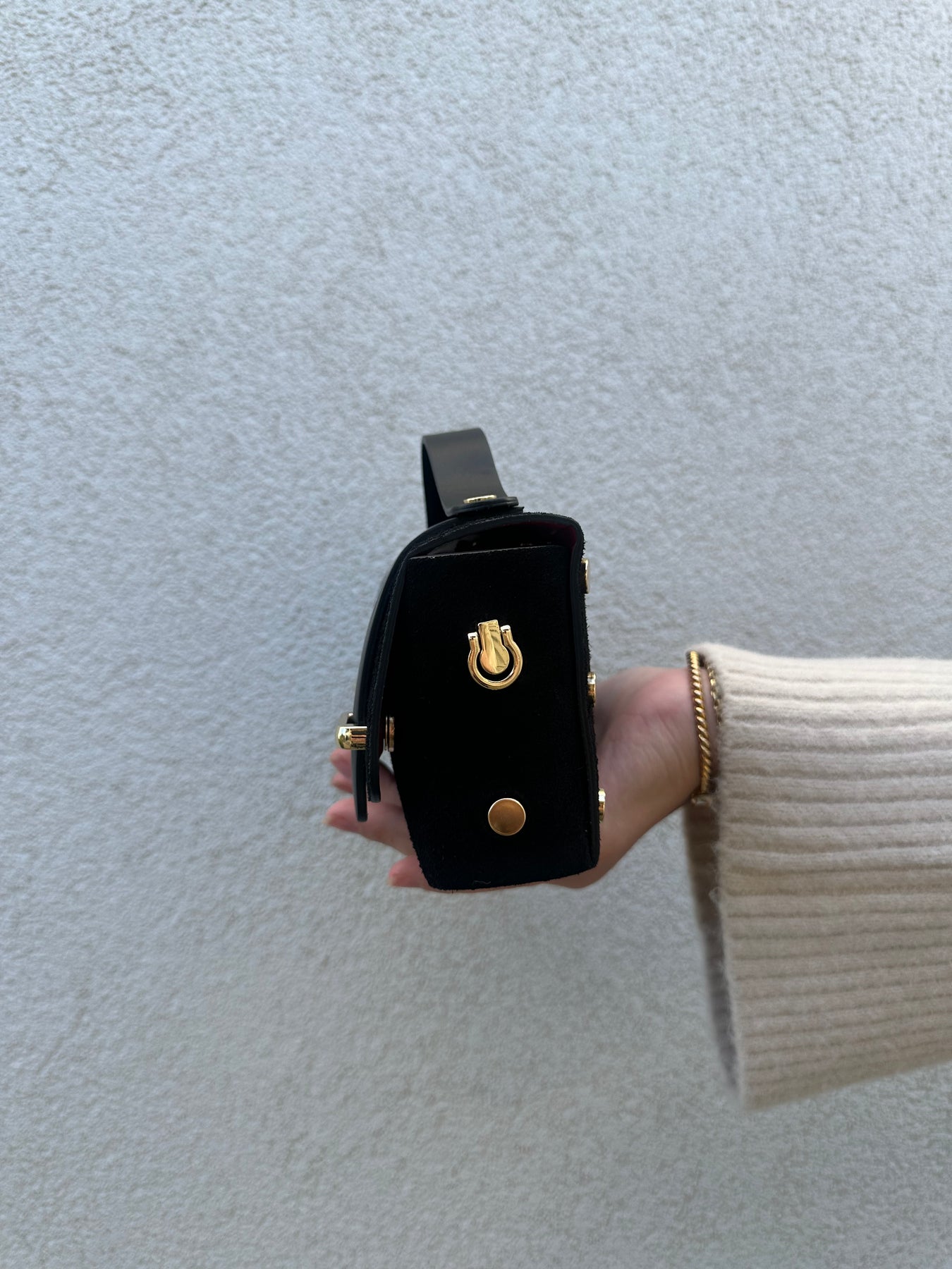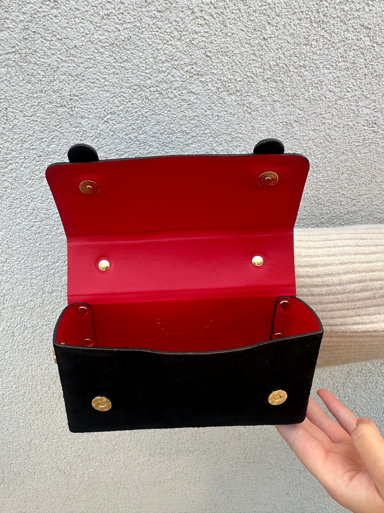 Mycket lyxig och elegant liten väska som ser ut som en stor väska fast i mini format, i 100% mocka och detaljer i 100% läder. Magnetlås. Ett fack innut i. Väskan är klädd i knall rött läder på insidan. Snygga guld nitar och guld detaljer pryder väskans alla sidor. En lång guldkedja i pansarmodell medföljer så väskan kan bäras crossbody, på axel, i armveck och i handen. En perfekt väska till fest, middag osv