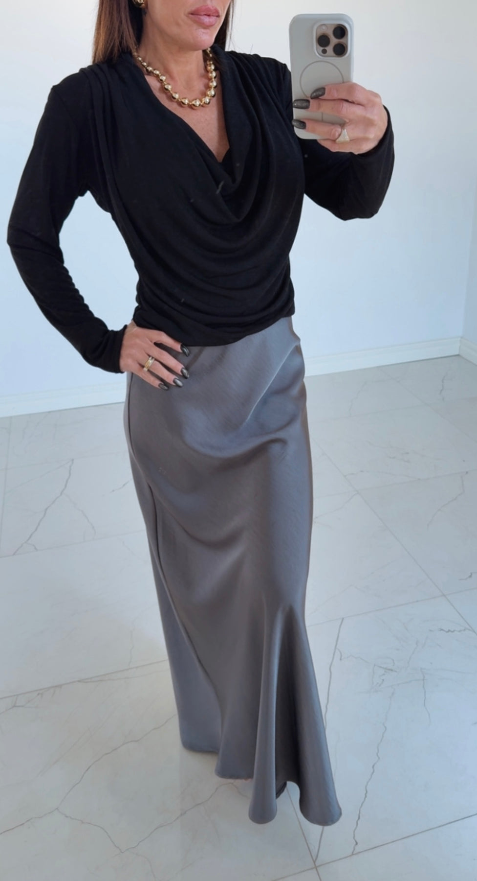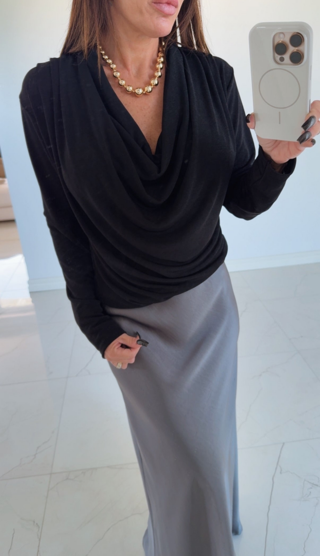 Svart topp med draperad halsringning och lång ärm. Modellen har en ledig passform med mjukt fall, vilket ger ett stilrent och sofistikerat uttryck. Tillverkad i stretchigt material för ökad komfort och rörelsefrihet. Passar både till vardag och mer uppklädda sammanhang.