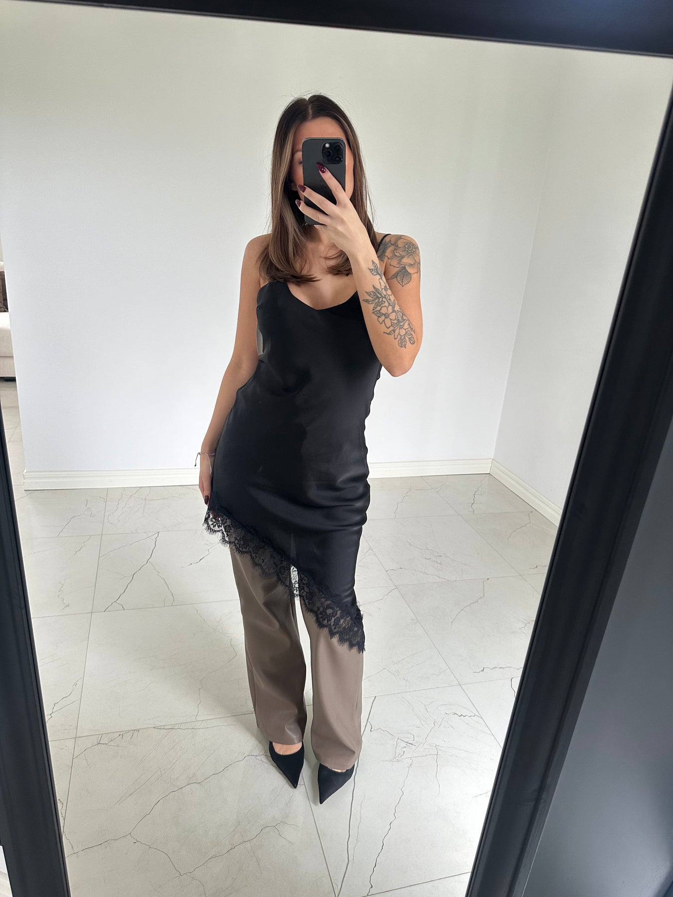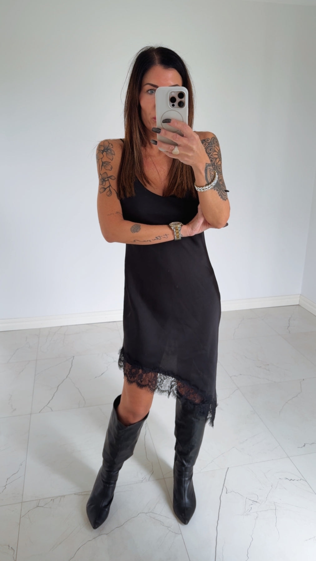 Svart klänning i satin med smala axelband och v-ringning. Modellen har rak passform och asymmetrisk nederkant med spetsdetaljer. Lätt glansigt tyg och enkel design gör den lätt att kombinera med boots eller klackar för både vardag och fest.