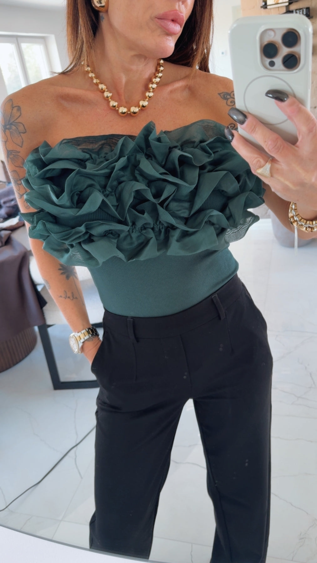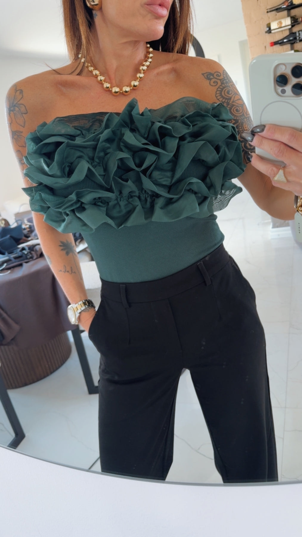 Favoriten är tillbaka även 2025! Denna festliga body med stora volanger över bysten. En ribbad body med knäppning som en trosa. Helt utan band upptill. En smal silicon remsa upptill vid bysten och runt ryggen för att den ska hålla sig uppe och på plats. Snyggt att ha under kavaj och under skinnjackan nu till hösten. Till högmidjade kostymbyxor eller till en högmidjad kjol.